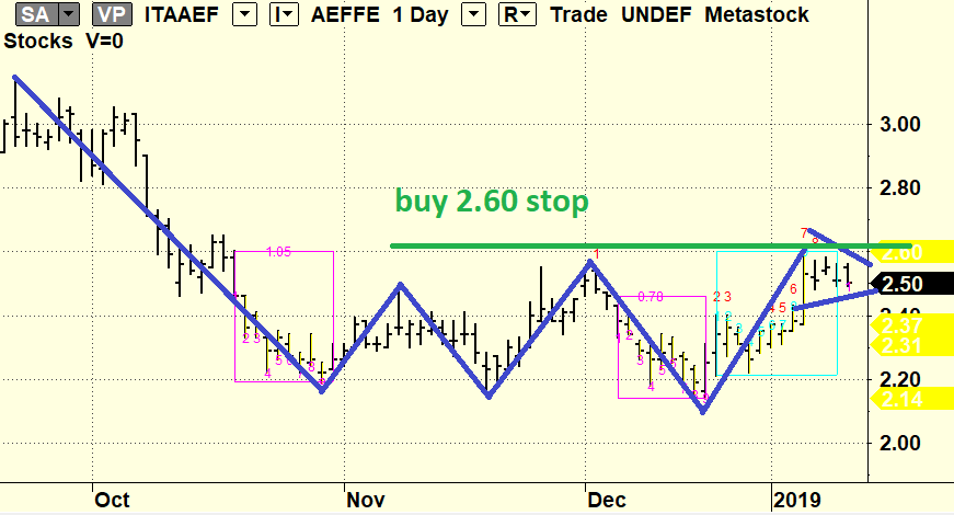 A livello ciclico sull’orizzonte temporale giornaliero notiamo la prima gamba di un rialzo (Set Up del Sequential di Thomas Demark) e quindi teoricamente ci dovrebbero essere ulteriori 13 barre rialziste. Nel breve l’azione ha disegnato un triplo minimo orizzontale e nelle ultime 4 sedute ha disegnato una spalla destra nella forma di un triangolo simmetrico poco sotto la resistenza dell’oscillazione orizzontale. Tentiamo un buy stop sopra il massimo di 2.60 euro, vendita del 50% della posizione ad un target superiore che comunichiamo dopo l'acquisto e quindi un trailing stop sotto il minimo delle ultime 5-10 barre.