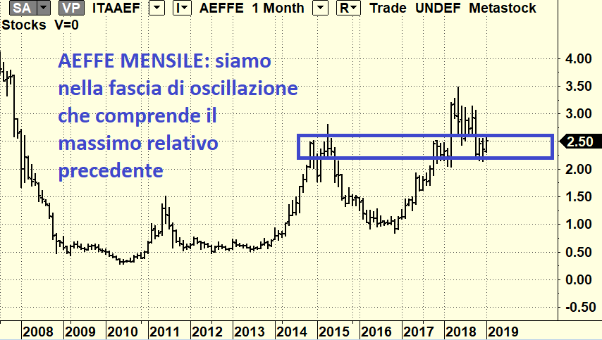 Tecnicamente siamo sul massimo storico del 2015 (pull back) ma in una situazione di bilancio completamente diversa perché abbiamo forza nella crescita della redditività. Di seguito il grafico mensile:
