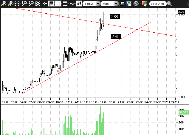 Da segnalare però, e in maniera anomala, dal momento che non amo trattare nei miei studi, azioni che si siano rese protagoniste di balzi a doppia cifra percentuale, la situazione grafica che si è venuta a creare su Giglio Group, proprio sul finire della giornata odierna.