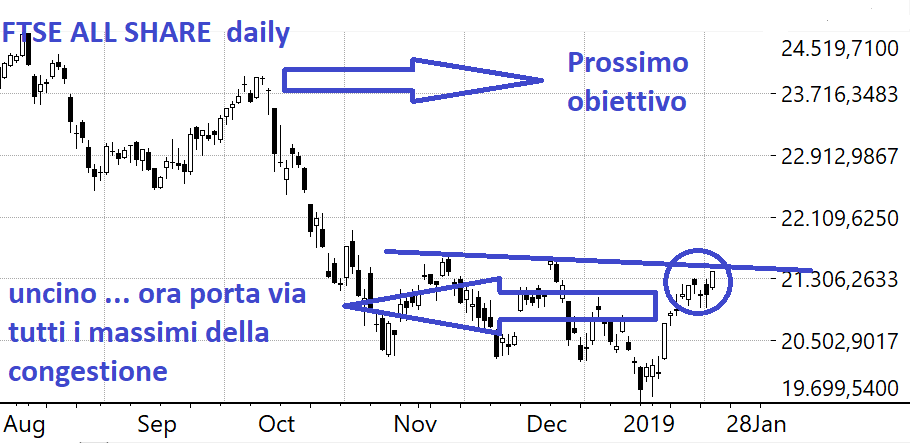 Succede sempre così: il rialzo arriva quando meno te lo aspetti. Con l’uncino di oggi il nostro mercato dovrebbe ritornare verso quota 24.000 del Ftse All Share perché la rottura dei massimi della congestione è roba da poco e lì si svilupperà un boato di acquisti.