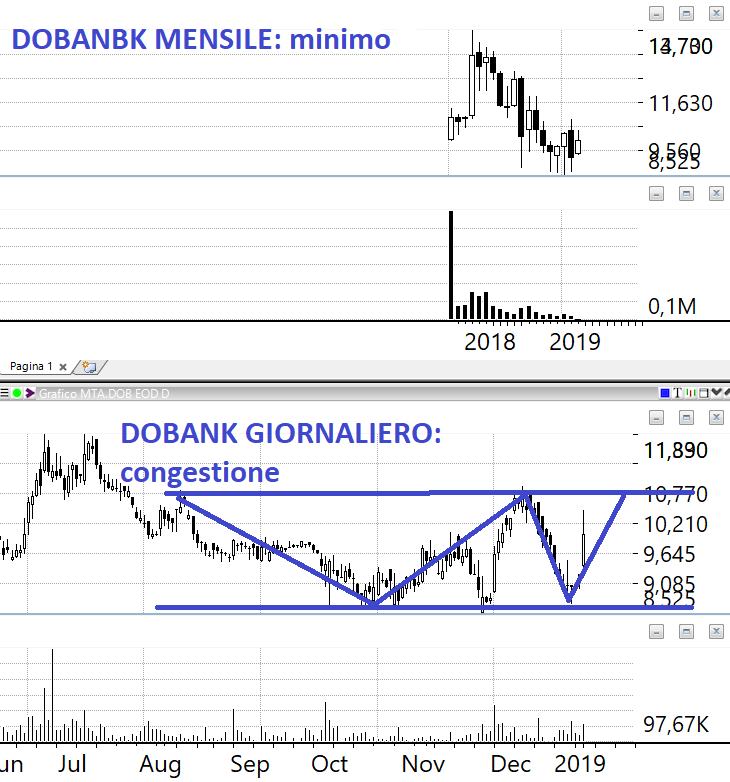 DOBANK: è un titolo sotto Sequential settimanale e per l’analisi fondamentale è un buy con un target price tra gli 11 e i 12 euro. Dopo una perdita pesantissima nel 2015 nel 2016 e 2017 ha chiuso il bilancio con un ROE a cavallo del +20%. Il prezzo odierno è nei pressi di quello di collocamento. La barra di oggi è molto promettente. Ovviamente vogliamo un pattern tecnico per entrare