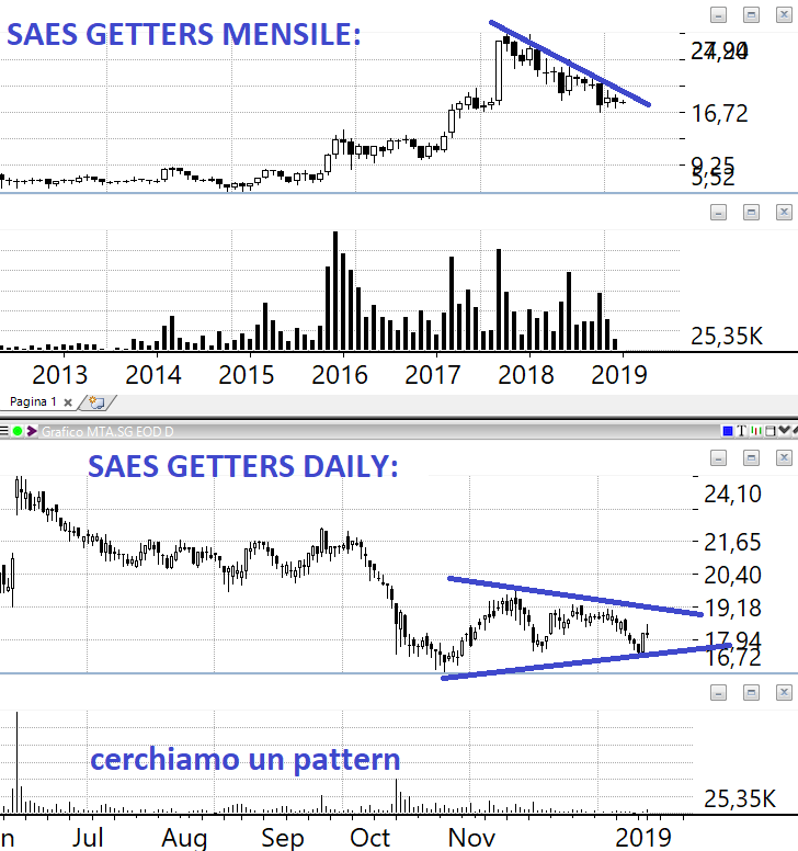SAES GETTERS: a livello fondamentale è una bella storia di turn around aziendale. Negli ultimi anni ha mostrato bilanci in crescita con lo sviluppo di una buona redditività tanto che gli analisti posizionano il target price davvero molto in alto (chi a 20 chi a quasi 30 euro, dati ovviamente da prendere con le molle come tutti i dati finanziari). Il ROE 2017 è stato di +11% mentre il ROI è stato del 28%. Tecnicamente sta disegnando una congestione stretta a punta pronta ad esplodere.