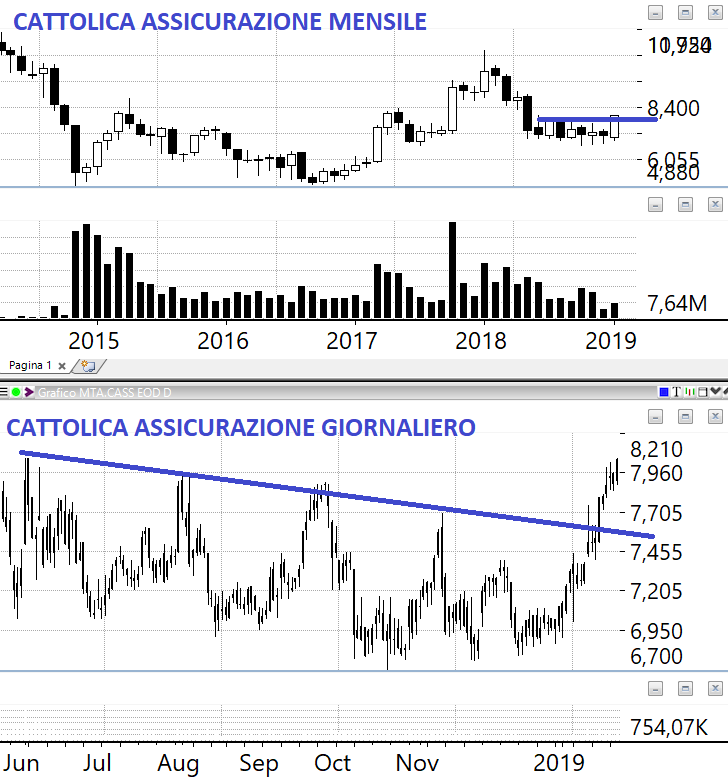CATTOLICA ASSICURAZIONI: è un titolo che ha un buon potenziale di apprezzamento in base all’analisi fondamentale, gli analisti lo vedono a un +10% dai prezzi attuali magari diciamo che si potrebbe azzardare anche un +20% ma ci siamo. E non è poco. Tra l’altro oggi non si è mosso molto al rialzo e quindi a differenza di Fiera Milano di cui parliamo da mesi e che non abbiamo avuto il coraggio di comprare e ci ha stupito oggi con un volo da +8% Cattolica sta ancora cincischiando sui massimi degli ultimi mesi. Ma siccome come San Tommaso ci vogliamo mettere il dito per il momento lo continuiamo a guardare senza fare niente.