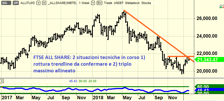 A livello di indice il nostro mercato è sul bagnasciuga: sostenere la tesi rialzista prima di avere uno dei due elementi che rappresento nel grafico che segue è quanto meno poco professionale. Noi abbiamo comprato 5 volte sul pattern del singolo grafico e senza aspettare l’indice. E questo in ossequio al concetto che se stiamo ad aspettare l’indice per comprare moriamo di fame. Ma da qui iniziare a spingere sull’acceleratore ce ne passa. Nel cammino verso una qualsiasi prova di rialzo (due elementi ci servono: rottura trendline oppure superamento di 3 massimi allineati) si possono incontrare titoli che ti supplicano di comprarli e quindi per carità di patria tu vieni loro incontro. Ma comprare l’intero mercato sarebbe un passo fatale se poi tutto quello in cui crediamo non si materializza. E di questi tempi il vento gira velocemente, ve lo assicuro.