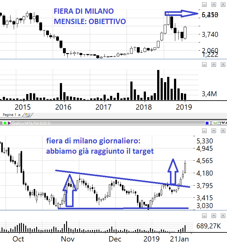 FIERA MILANO: a forza di guardare Cattolica Assicurazioni farà la stessa fine di Fiera di Milano che oggi ci è scivolata via tra le dita e noi come dei piciu a guardare mentre saliva. Su Fiera di Milano bisognerebbe cercare di comprarla se ritorna a ritracciare nel più classico dei pull back verso il massimo della resistenza di 4.125 oppure nel primo uncino / congestione disponibile. La via verso i massimi precedenti è ancora lunga. A livello fondamentale per la maggioranza degli analisti sembra correttamente prezzata.