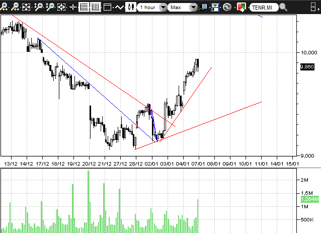 Qualora, badate bene, e soltanto se, il mercato generale desse segni di consolidamento , si può indicare un ingresso, per i più temerari, in area 9.71 € per azione e per i più prudenti un ingresso in area 9.32 € per azione, sempre rispettando lo stop loss alla rottura di tali valori, vede un target potenziale a 10.6 € per azione.