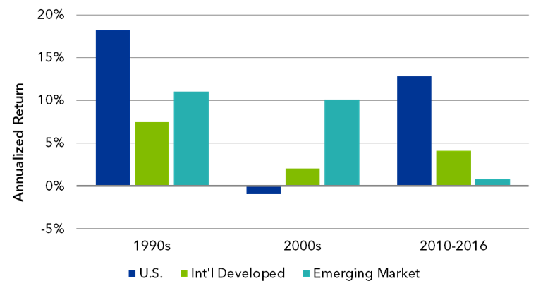 Ecco la risposta riferita a tre distinti periodi (1990 -1999 / 2000 - 2009 / 2010 - 2016) – fonte iShares.