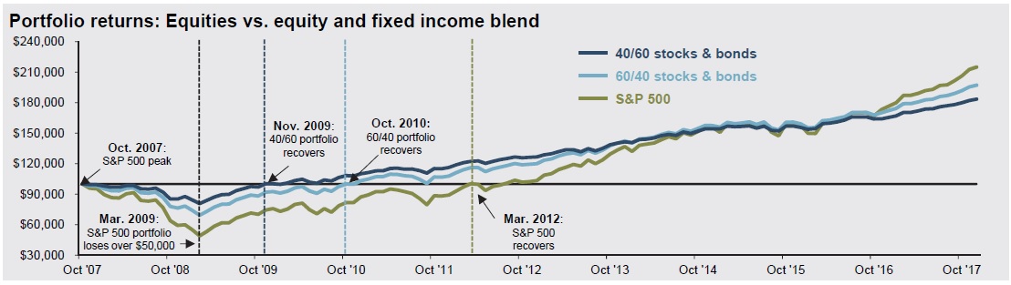 Qui la situazione si complica e la risposta diventa meno semplice a causa degli effetti distorcenti dei Quantitative Easing, soprattutto se prolungati. In teoria e in pratica la detenzione di obbligazioni è realmente protettiva e lo dimostra questo grafico di JP Morgan riferito – come spiega il titolo – a un confronto dall’ottobre 2007 (massimi dell’S&P 500) fino al termine del 2017, relativamente a tre scelte (puro azionario Usa – abbinata 60% azionario-40% obbligazionario e abbinata 40% azionario-60% obbligazionario).