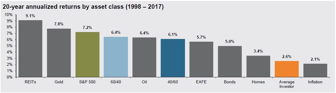 Reit = Real Estate Investment Trusts – società finanziarie attive nell’immobiliare - Gold = Oro – S&P 500 = Indice Standard & Poor 500 – 60/40 = Abbinata 60% azionario e 40% obbligazionario – Oil = Petrolio – 40/60 = Abbinata 40% azionario e 60% obbligazionario – Eafe = Azionario Europa/Australasia/Far East, ovvero Paesi ad alto sviluppo economico/sociale – Bonds = Obbligazionario puro – Homes = Investimenti immobiliari diretti – Average Investor = Media di rendimento dei portafogli – Inflation = Inflazione media.