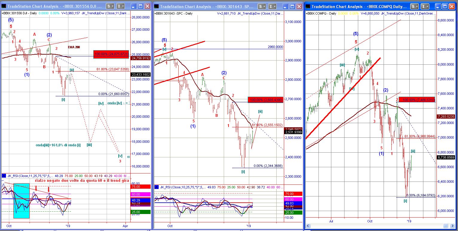 In queste prime sedute dell’anno è proseguito lo sviluppo della correzione di onda [ii] che si avvicina ora al livello di ritracciamento del 61,8%. Questo livello non è ovviamente il vangelo, ma semplicemente il ritracciamento più frequentemente riscontrabile nelle onde seconde. Nel grafico sottostante vedete affiancati il Dow Jones, l’S&P500 ed il Nasdaq Composte. Evidenziate in rosso le tre soglie di invalidazione del modello. Quindi l’onda [ii] potrà tranquillamente superare il 61,8% ma non superare i livelli in rosso, perché allora dovremmo rivedere il conteggio e quella fino ad ora indicata come onda[ii] diventerà gioco forza qualcos’altro.