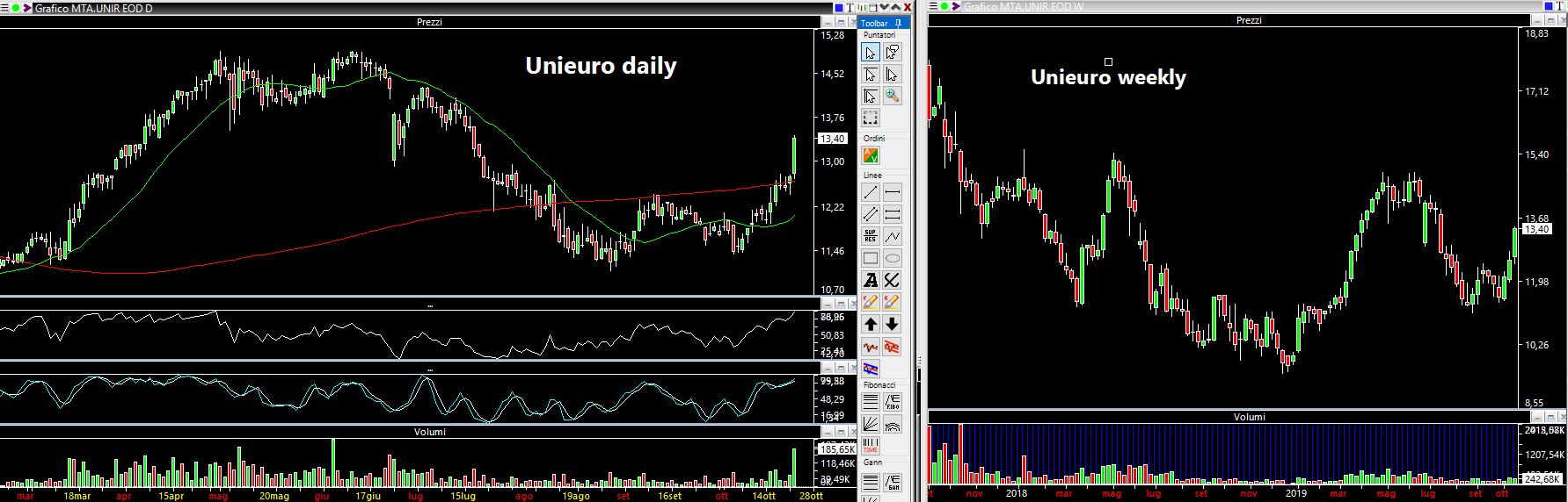 Non male la rottura sul daily e per il momento anche sul weekly. Però ancano un pò i volumi. Da seguire perché potrebbe puntare verso l'area 19 euro. Ripeto: non mi convincono i volumi bassi.