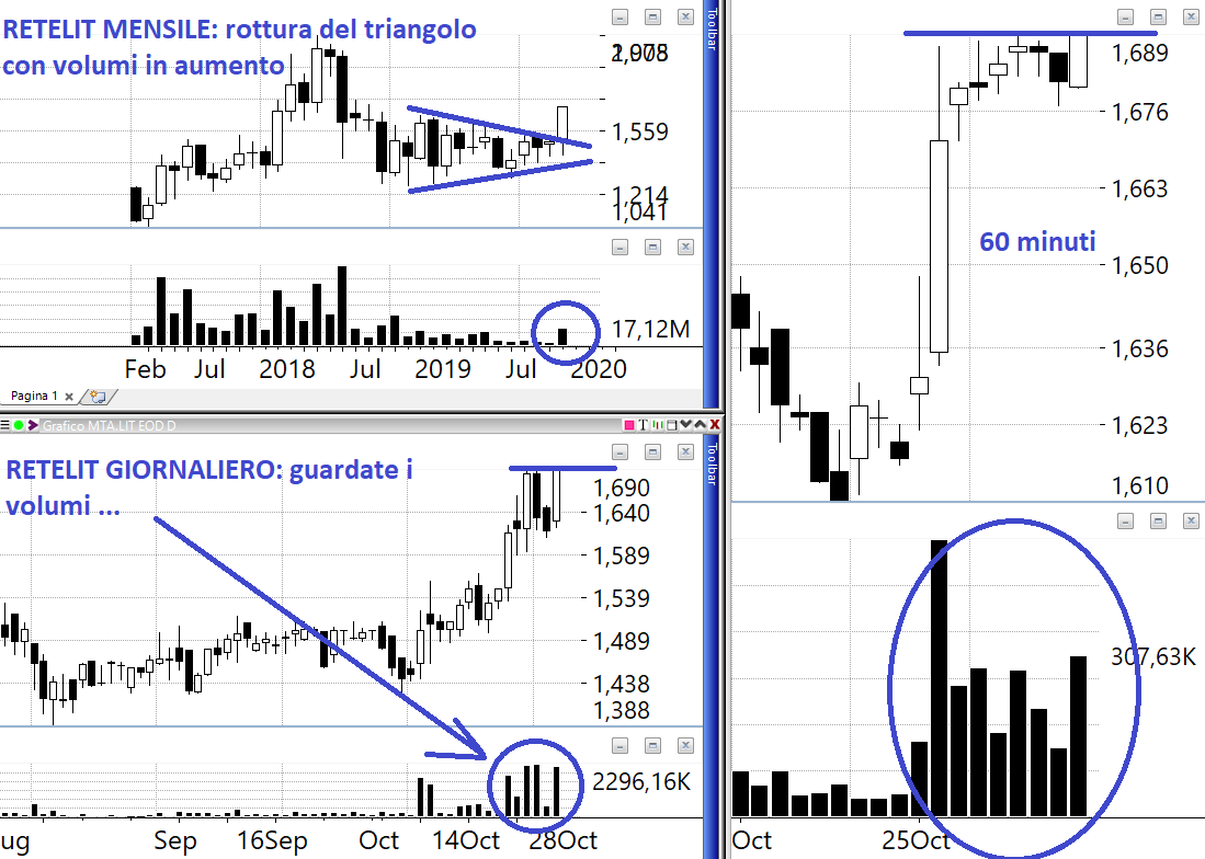 Tecnicamente ha rotto una fase di congestione di tipo simmetrico sul mensile mentre sul daily accumula volumi e uncina al rialzo.
