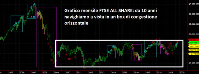 Nel grafico qui sotto mostriamo il disastro degli ultimi 10 anni con i prezzi che sono oscillati in orizzontale. Nel grafico per i lettori più esperti si nota anche un Sequential di Thomas Demark in corso sulle barre mensili che ha segnato 11 bare di rialzo e quindi nel mese di gennaio 2020 dovrebbe dare un punto di inversione ciclico sia al rialzo (poco probabile) che al ribasso (molto probabile).