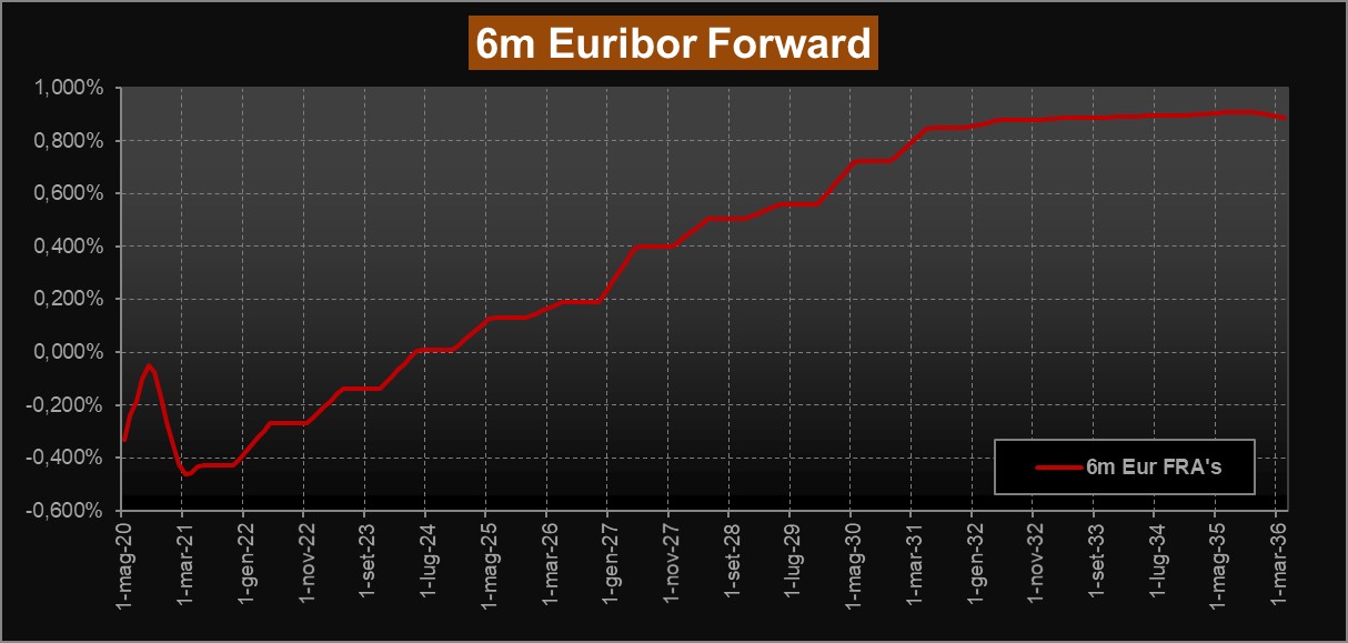 Torniamo alle nostre analisi, con la nostra consueta lettura del mercato obbligazionario attraverso la ZC-Yield Curve. Questa settimana registriamo una lieve contrazione dei rendimenti, sempre negativi sino alle scadenze 2027; il tratto a lunga scende di una manciata di bps e si porta in area 0,50% di rendimento contro lo 0,53% della scorsa settimana per le scadenze 2049; anche sulla scadenza a 10 anni si scende e ci portiamo in area 0,07%. La curva nel suo complesso mantiene sempre la sua ripidità come orami osserviamo da diverse settimane, così come si riscontra sempre una certa erraticità nella parte a breve. Scendono un po’ anche i forward su Euribor 6 mesi che sul tratto a lunga si portano ora in area 0,90% rispetto ad area 1,00% della scorsa rilevazione, e sul tratto a breve ora siamo poco oltre area -0,45%.