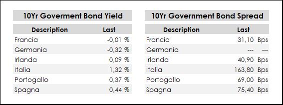 Contrastati i rendimenti dei decennali, con i periferici che allargano un po’, e in aumento più o meno marcato gli spread contro Bund, con il decennale tedesco che rimane poco sopra area a -0,30% di rendimento, la Francia che sale a -0,01% e l’Irlanda che va a 0,09%. Sale più deciso il rendimento della Spagna che va a 0,44%, così come quello sia del Portogallo che sale a 0,37% sia dell’Italia che va all’1,32%. A livello di spread Vs Bund abbiamo Portogallo, Spagna e Italia rispettivamente a 69 bps, 75 bps e 164 bps.