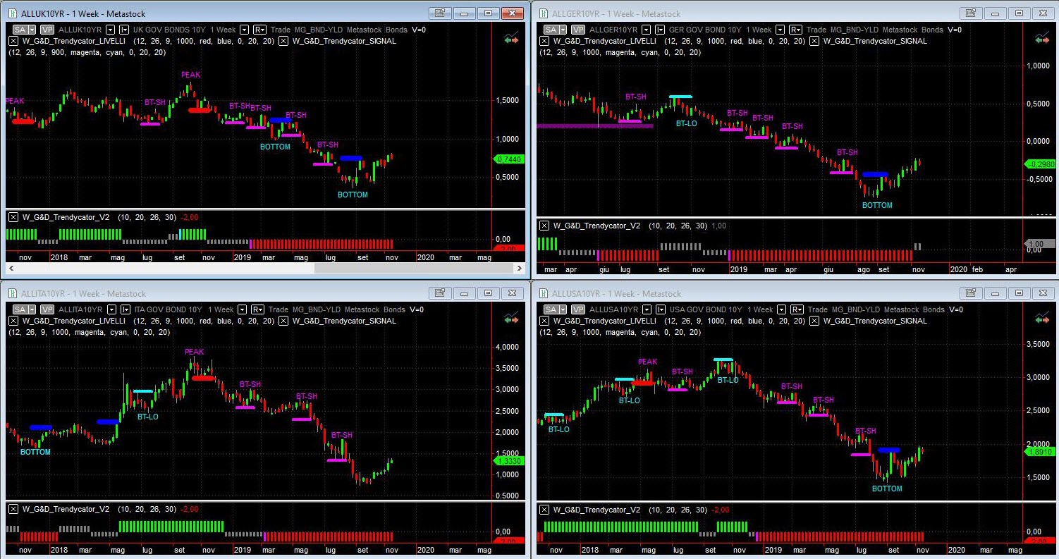 Osservando – a livello di analisi integrata – le curve dei rendimenti dei benchmark decennali dei principali mercati al momento ecco che arrivano le prime avvisaglie serie di un potenziale cambio di rotta a livello strategico, almeno per l’aera Bund. Ormai il rimbalzo dai minimi si è dipanato su tutti i mercati e siamo a contato con resistenze importanti, che fanno un po’ da spartiacque. Il modello Trendycator è ora NEUTRAL sull’area BUND con il rendimento del decennale tedesco nei pressi di area -0,30%, di fatto a contatto con la resistenza in area -0,20% il cui superamento avrebbe davvero il sapore della potenziale inversione del trend. Di converso Trendycator he rimane SHORT su tutte le altre curve analizzate, con l’area UK che vede il Gilt sempre a contatto con la resistenza a 0,80% di rendimento; sul Btp Trendycator sempre SHORT e senza evidenza di un BOTTOM – come invece accaduto sugli altri mercati – con rendimenti ora be sopra area 1,00% e proiettati verso la resistenza a 1,50%. Stesse dinamiche anche per i rendimenti USA, con Trendycator ancora SHORT sul decennale che però è ora nei pressi della resistenza al 2,00% di rendimento.