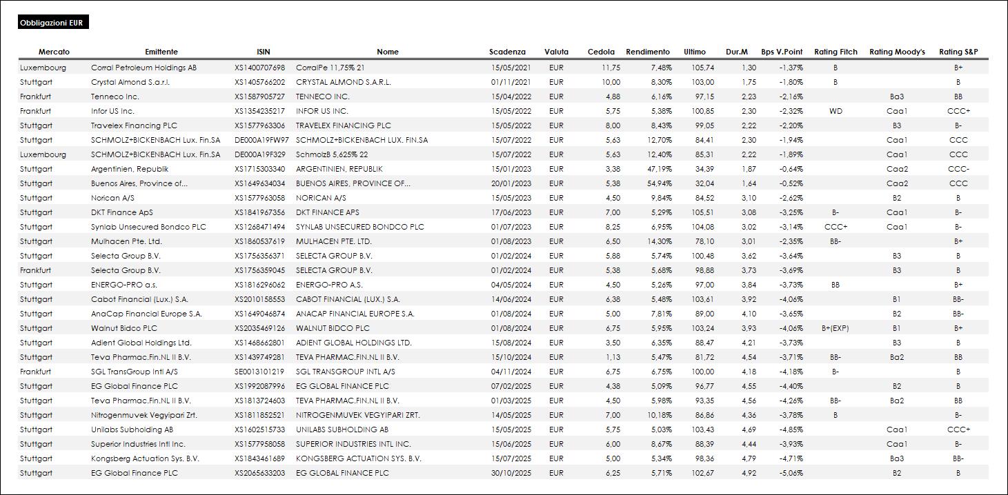 ATTENZIONE: si rammenta che i bond High Yield hanno un rischio spesso non trascurabile in termini di Credit Risk, per cui non sono da considerarsi come suggerimenti operativi, bensì come mere segnalazioni che non saranno poi seguite in modo organico. Pertanto, chi decidesse di prendere spunto da tali segnalazioni dovrà poi seguire in via autonoma l’andamento del titolo e le eventuali notizie relative all’emittente, controllando con frequenza il mercato.