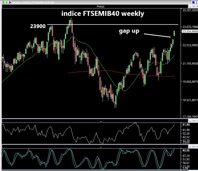 Settimana piuttosto movimentata e su svariati fronti (finalmente!). Complice la moltitudine di dati societari usciti sul mercato si è creata un pò di volatilità sui titoli principali ma non solo. Nella passata ottava ci siamo lasciati con un indice in forte gap up sul weekly, ricordate ? Il grafico si presentava così