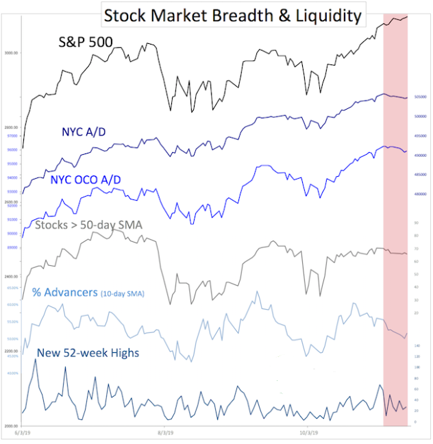E non contento di guardare solo gli advancing stocks il nostro analista pubblica una seconda tabella con tutti gli indicatori di breath che a suo dire mostrerebbero come il mercato azionario usa stia segnando il passo.
