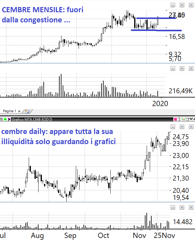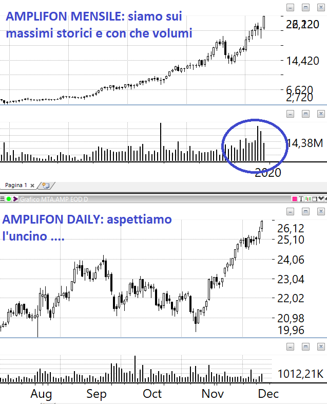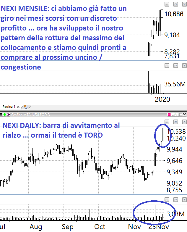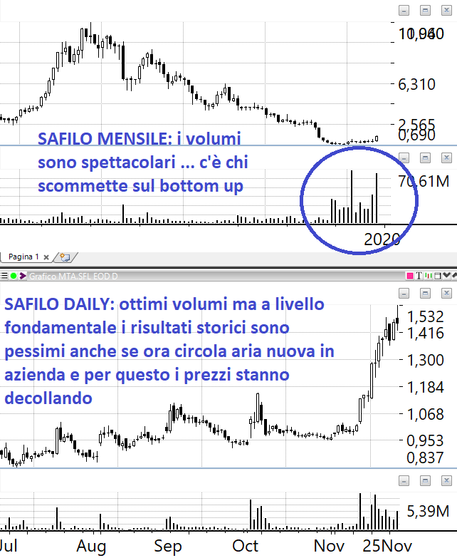 Il pattern è sempre lo stesso e lo vediamo sulle azioni che abbiamo in portafoglio: che si chiamino El.En piuttosto che Gamenet piuttosto che Eurotech alla fine se considerate con attenzione è sempre lo stesso. Sul grafico mensile abbiamo l’allungo poco sotto i massimi storici o pluriannuali e quindi una serie consecutiva di barre daily a 45 gradi con volumi storicamente rilevanti ovvero volumi che sono superiori non solo a quello che è successo l’anno prima ma anche rispetto a quello che è successo 3 anni fa o 4 anni fa.