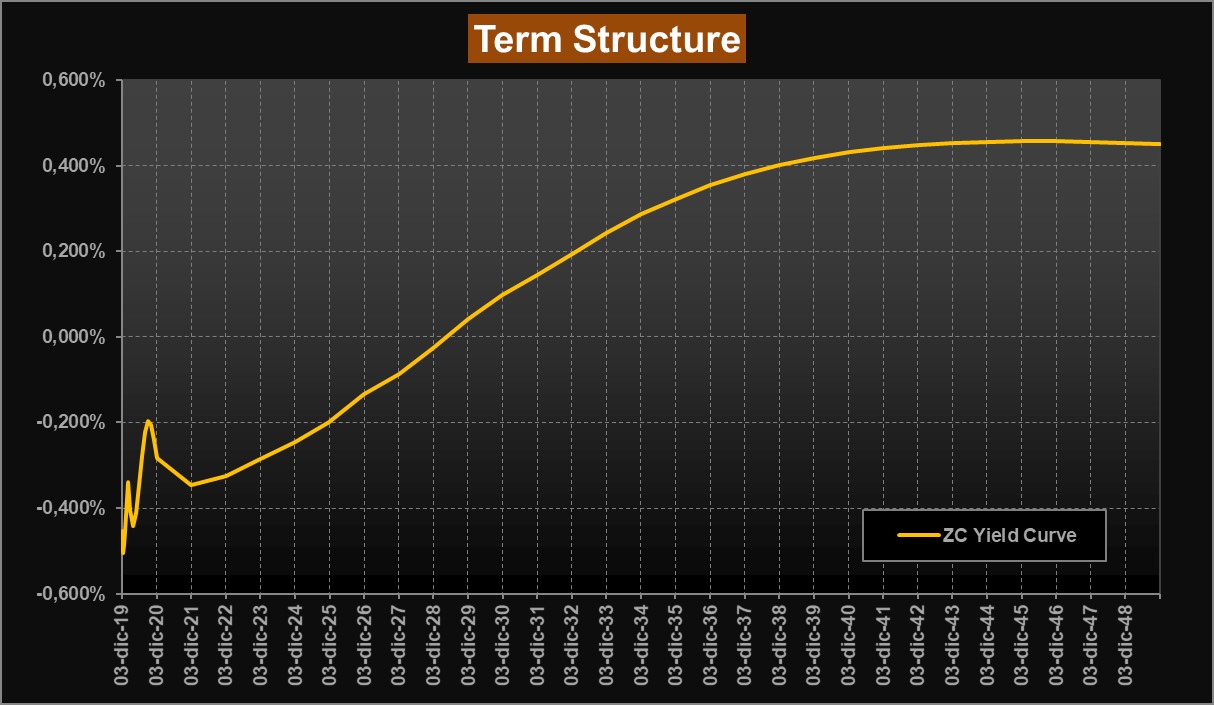 Torniamo alle nostre analisi, con la nostra consueta lettura del mercato obbligazionario attraverso la ZC-Yield Curve. Anche questa settimana prosegue la lieve contrazione dei rendimenti già riscontrata da un paio di settimane a questa parte. I rendimenti sono ora negativi sino alle scadenze 2028; il tratto a lunga scende e si porta in area 0,45% di rendimento contro lo 0,48% della scorsa settimana per le scadenze 2049; anche sulla scadenza a 10 anni si scende un po’ e ci si porta in area 0,04%. La curva nel suo complesso mantiene la ripidità acquisita oramai da qualche tempo rimanendo molto erratica e nervosa nella parte a breve. Scendono marginalmente anche i forward su Euribor 6 mesi che sul tratto a lunga si portano in area 0,88% rispetto ad area 0,89% della scorsa rilevazione, mentre sul tratto a breve ora siamo sempre compressi tra area -0,50% e area -0,40%.