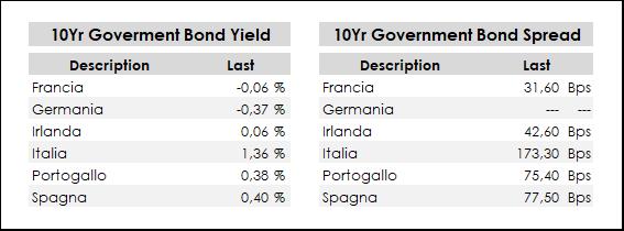 In lieve discesa anche i rendimenti dei decennali (salvo l’Italia…) e spread contro Bund in live salita. Il decennale tedesco si allontana un po’ da area a -0,30% di rendimento e si porta a -0,37%, la Francia scende a -0,06% e l’Irlanda va allo 0,09%. Scendono anche la Spagna che va allo 0,40% di rendimento e il Portogallo che cala a 0,38%; male l’Italia che sale all’1,36%. A livello di spread Vs Bund abbiamo Portogallo, Spagna e Italia rispettivamente a 75 bps, 77 bps e 173 bps.