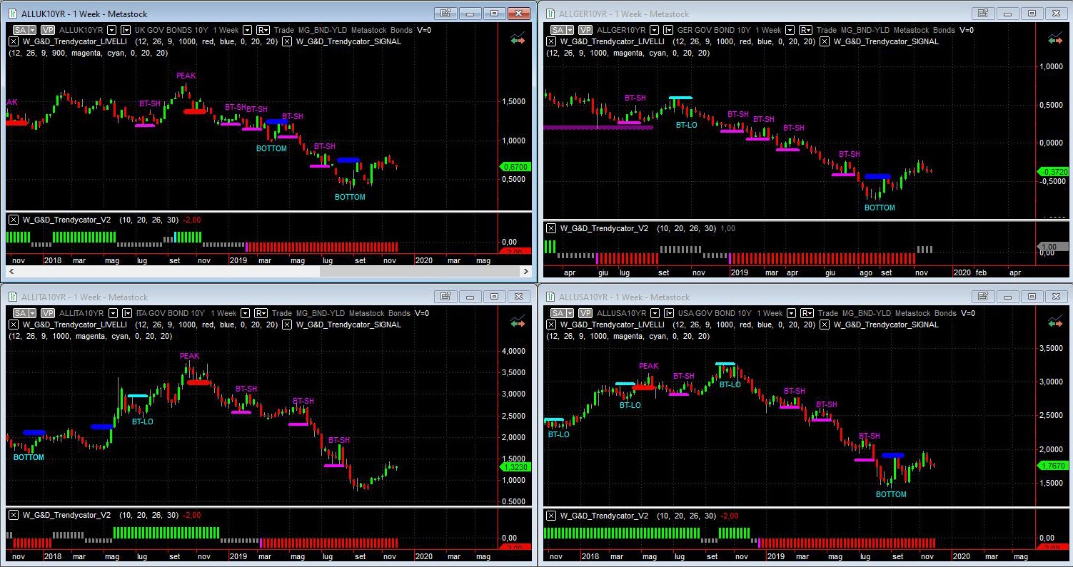 Osservando – a livello di analisi integrata – le curve dei rendimenti dei benchmark decennali dei principali rimangono confermate le dinamiche osservate nelle settimane recenti, e per ora non vi sono ulteriori indicazioni su un eventuale cambio di rotta. Pertanto, su tutte le aree valutarie esaminate il rimbalzo dai minimi di agosto può considerarsi al momento concluso, con rendimenti che si sono allontanati sensibilmente dalle importanti resistenze di medio termine che, come detto nelle precedenti analisi, fungono da spartiacque tra stasi e inversione. Il modello Trendycator si conferma quindi NEUTRAL sull’area BUND con il rendimento del decennale tedesco che torna a scendere e va ora verso area -0,40%, allontanandosi dalla resistenza in area -0,20%. Trendycator rimane ancora SHORT su tutte le altre curve analizzate, con l’area UK che vede il Gilt ripiegare sotto area 0,70% di rendimento; solo il nostro Btp viaggia per i fatti suoi, ma purtroppo è la nostra sorte a causa dei noti e mai risolti problemi di politica interna e credibilità all’estero. Così il nostro decennale va marginalmente sopra area 1,30% di rendimento e continua a puntare la la resistenza a 1,50% di rendimento. Infine, poco mossi i rendimenti USA, con Trendycator che si conferma SHORT sul decennale, stabile nell’intorno di area 1,75% di rendimento.