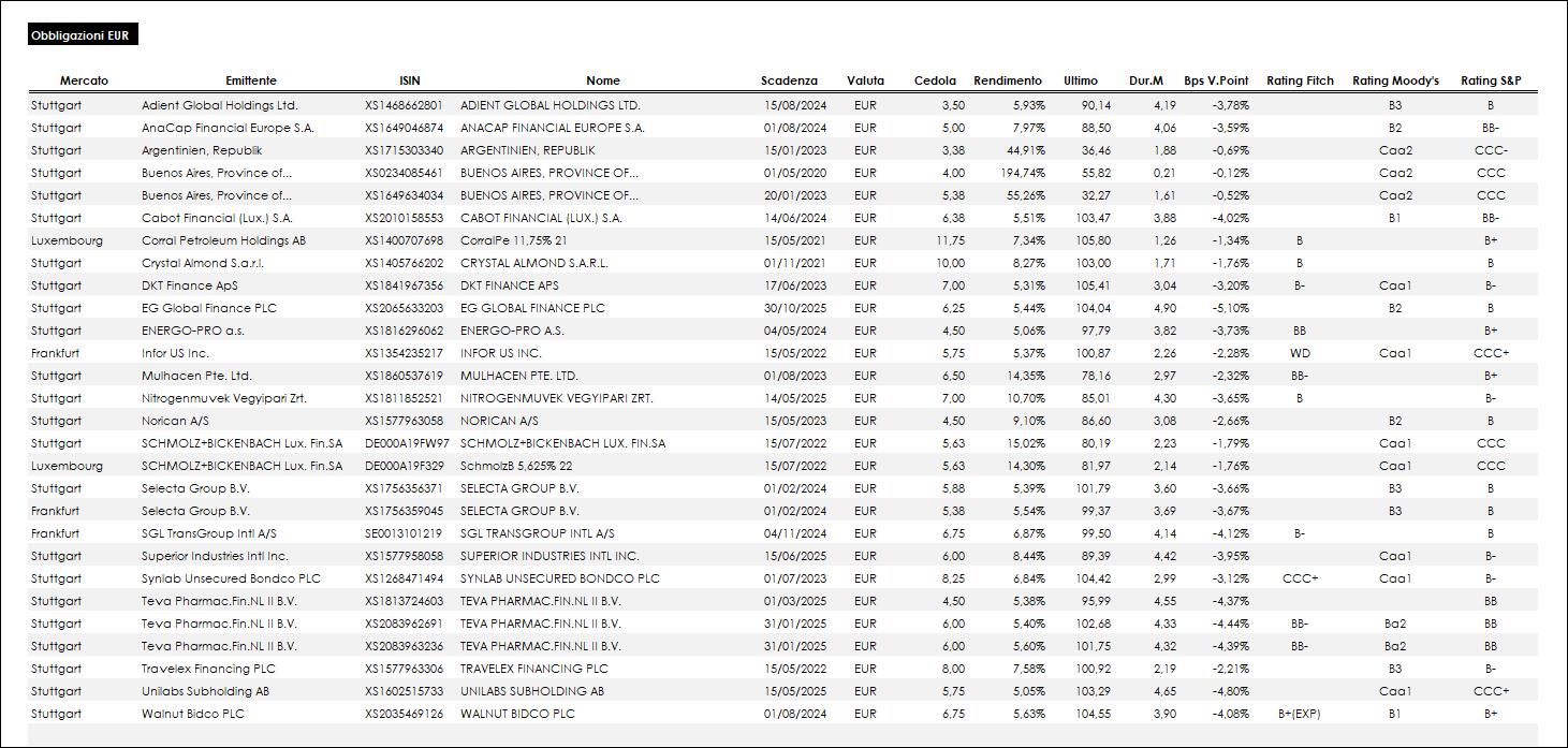 ATTENZIONE: si rammenta che i bond High Yield hanno un rischio spesso non trascurabile in termini di Credit Risk, per cui non sono da considerarsi come suggerimenti operativi, bensì come mere segnalazioni che non saranno poi seguite in modo organico. Pertanto, chi decidesse di prendere spunto da tali segnalazioni dovrà poi seguire in via autonoma l’andamento del titolo e le eventuali notizie relative all’emittente, controllando con frequenza il mercato.