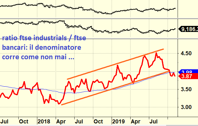 Che fare ? Ci manca un +10% per arrivare al massimo di 26.890 del Ftse All Share e l’unica cosa di intelligente che possiamo dire è che sembra essersi rovesciato il rapporto tradizionale tra industriali e bancari. I bancari stanno godendo di una forza relativa che finora non si era vista tanto da rompere al ribasso (ribasso perché sono denominatore del ratio industriali / bancari) il canale in cui erano imprigionati dal maggio scorso.