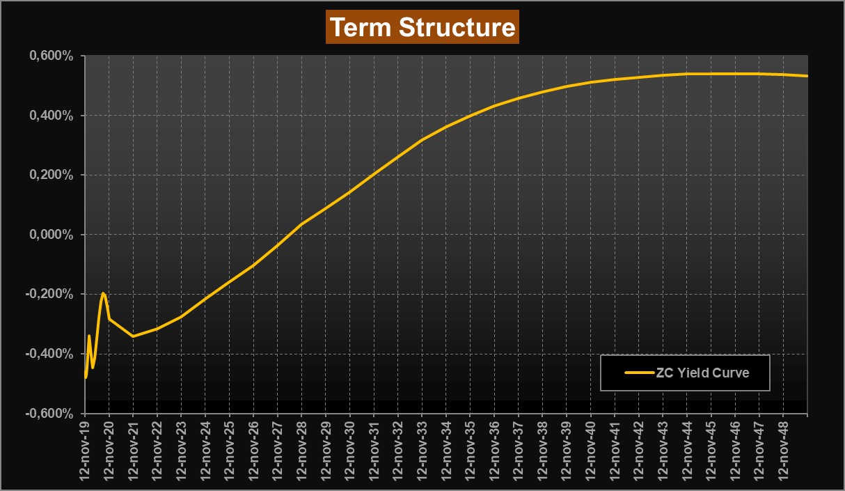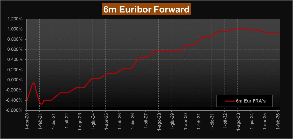 Torniamo alle nostre analisi, con la nostra consueta lettura del mercato obbligazionario attraverso la ZC-Yield Curve. Questa settimana registriamo una lieve salita dei rendimenti, ora negativi sino alle scadenze 2027; il tratto a lunga sale di qualche bps e si porta in area 0,53% di rendimento contro lo 0,46% della scorsa settimana per le scadenze 2049; anche sulla scadenza a 10 anni saliamo e ci portiamo in area 0,09%. La curva nel suo complesso mantiene sempre la forma più ripida assunta ormai da qualche tempo, così come si conferma ancora molto molto nervosa nella parte a breve. Salgono anche i forward su Euribor 6 mesi che sul tratto a lunga si portano poco sopra area 1,00% rispetto ad area 0,80% della scorsa rilevazione, così come sul tratto a breve ora verso area -0,40%.