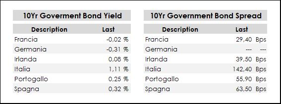 In aumento anche i rendimenti dei decennali, mentre sono sostanzialmente stabili gli spread contro Bund, con il decennale tedesco che risale in area a -0,31% di rendimento, la Francia che sale a -0,02% e l’Irlanda che va a 0,08%. Sale anche il rendimento della Spagna che va a 0,32%, così come quello del Portogallo che si assesta a 0,25% e quello dell’Italia che va all’1,11%. A livello di spread Vs Bund abbiamo Portogallo, Spagna e Italia rispettivamente a 56 bps, 63 bps e 142 bps.
