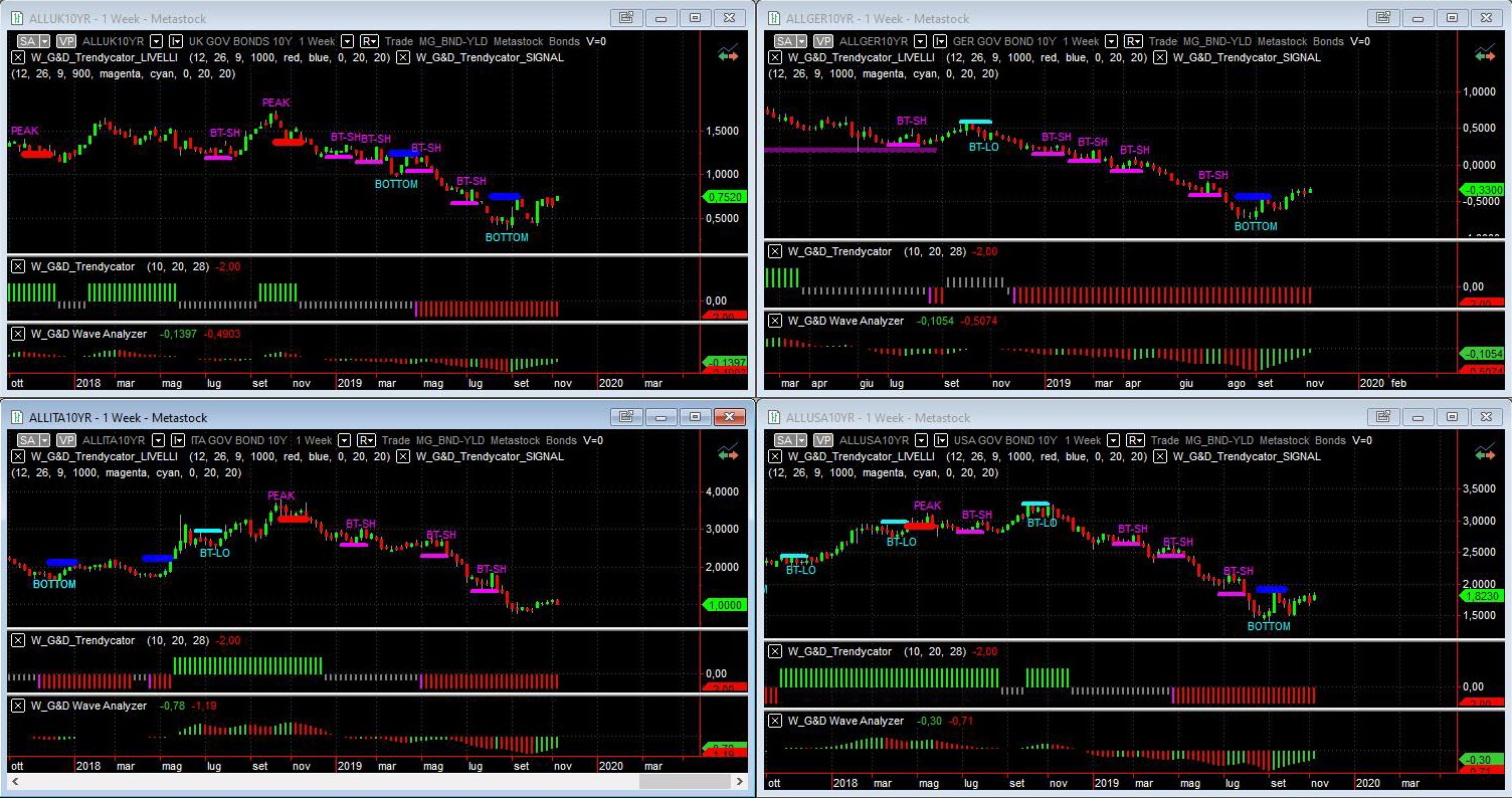 Osservando – a livello di analisi integrata – le curve dei rendimenti dei benchmark decennali dei principali mercati al momento sono sempre valide le due ipotesi formulate qualche tempo fa, ovvero stasi oppure potenziale cambio di rotta. A livello strategico continua a cambiare nulla, posto che il modello Trendycator si conferma stabile nelle sue indicazioni, ma come si è già detto dai BOTTOM registrati a suo tempo si è sviluppato un rimbalzo dei rendimenti che continuano a rimanere a contatto con le resistenze di breve. Per cui attualmente le evidenze del modello sono tutte confermate, con Trendycator che rimane SHORT su tutte le curve analizzate, con l’area UK che vede il Gilt in lieve salita in area 0,75% di rendimento; sull’area BUND il rendimento risale un po’ e si porta nell’intorno di area -0,30%. Sul Btp Trendycator ancora SHORT con rendimenti sempre a cavallo di area 1,00%, talvolta poco sopra a talvolta poco sotto. Sostanzialmente stabili i rendimenti USA, con Trendycator sempre SHORT sul decennale che si porta ora in area 1,82% di rendimento contro l’1,80% della scorsa settimana.