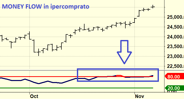 Oggi è il giorno della mossa finale e mi sembra che tutti gli indicatori puntino per un ritracciamento. Di seguitio il grafico del Money Flow che sul daily è in ipercomprato da diverso tempo.