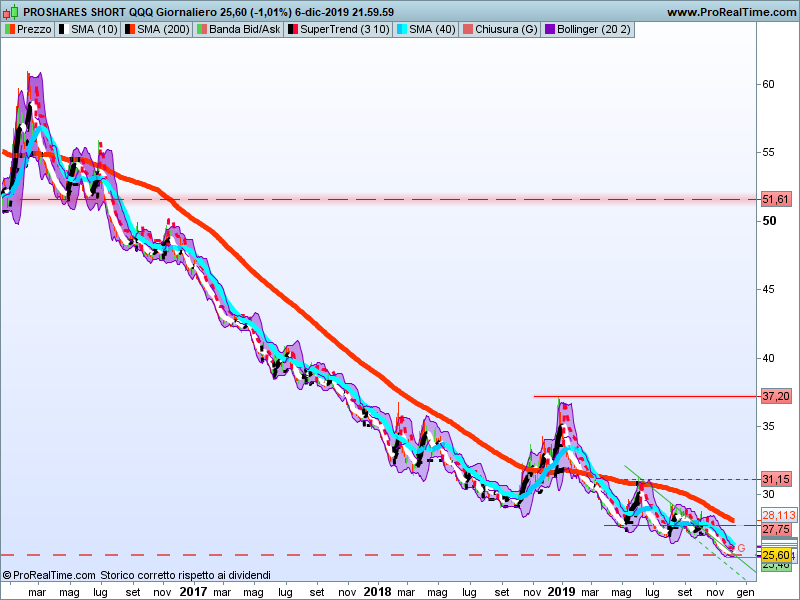 Guardate il grafico qui sotto. Si riferisce all’Etf Proshares short QQQ con sottostante l’inverse sul Nasdaq (a replica lineare). Purtroppo – essendo privo di Kiid – non è acquistabile in Italia, salvo da parte della clientela professionale. Difficile dire se è arrivato su un supporto mancando riferimenti storici utili in tal senso. Certo è che si presterebbe a un bel piano di accumulo in prospettiva futura, sebbene le previsioni dell’industria finanziaria stiano migliorando per il 2020, allontanando i timori di una pesante recessione negli Usa. Ciò non esclude che in un anno di elezioni presidenziali i timori di tensioni crescano così come il riscontro di un periodo espansivo delle Borse ormai troppo prolungato. Un piano di acquisto quindi su Etf short riferiti a Wall Street è una scelta da prendere in considerazione, purché riferito a cloni a replica lineare – quindi non a leva – allo scopo di non subire l’impatto nefasto del cosiddetto “interesse composto“, caratteristico di quelli appunto a moltiplicatore della performance.