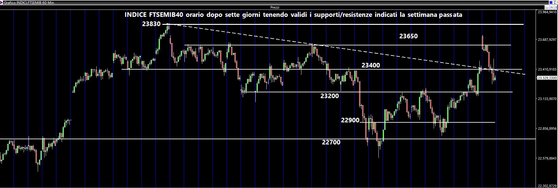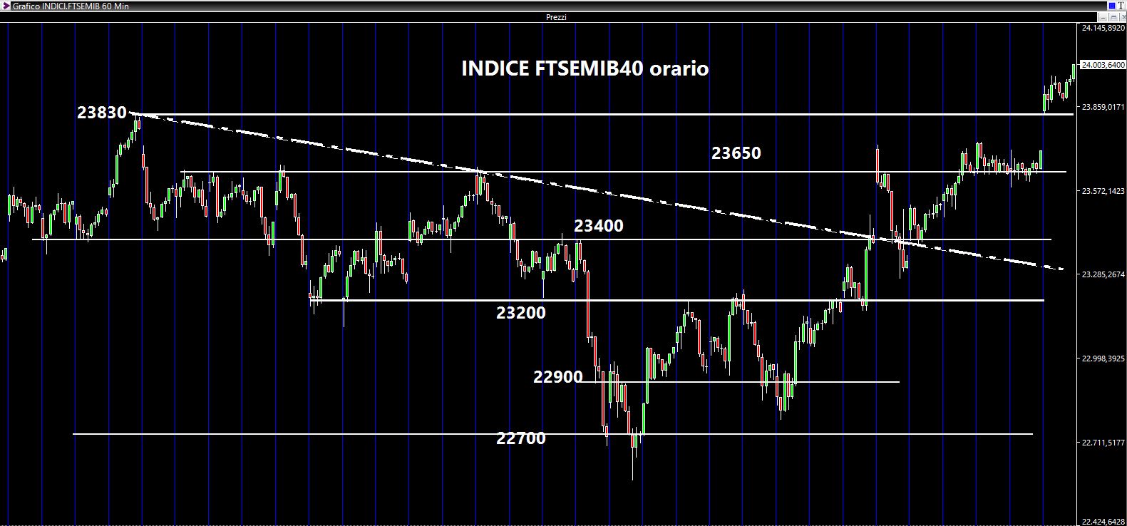 Dal confronto dei due grafici (notate bene: con le STESSE linee orizzontali senza che siano state modificate) si comprende bene come i livelli di 23400 e 23650 abbiano funzionato perfettamente come aree supportili. Il secondo livello in particolare è stato il fulcro attorno al quale i prezzi hanno scambiato per oltre due sedute. E soprattutto la cosa interessante è che i prezzi, nella giornata di venerdì, hanno aperto esattamente a 23830 punti di indice (la famosa resistenza) la cui rottura ha permesso un allungo dei corsi verso territori quasi "inesplorati" se non andando molto a ritroso nel tempo. Cosa fare a questo punto ? Prima di tutto il segnale è buono, ma personalmente nutro dubbi sulla sua validità. Il motivo è semplice: andiamo verso sedute che saranno caratterizzate da bassissimi scambi a causa delle festività. Quindi se si salirà lo si farà con aria rarefatta e quindi si camminerà su un terreno estremamente fragile. Almeno fino al 7 Gennaio per quanto mi riguarda. Faccio notare che abbiamo un gap che sarà potenzialmente da chiudere e che si è originato proprio ieri (venerdì, ndr). Quello che mi aspetto quindi è che per le prossime sedute e prima del vero rientro dalle vacanze il mercato possa continuare quasta luna di miele col rialzo, ma sarà più una scappatella piuttosto che un rapporto basato su basi solide e durature. Estrema cautela quindi.