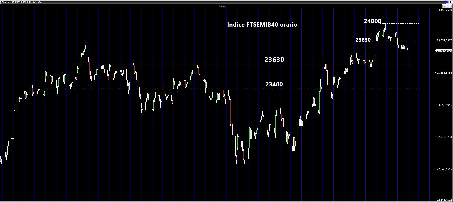 La prossima settimana avrà solo tre sedute di Borsa aperta (lunedì 30, giovedì 2 e venerdì 3 gennaio) e credo che il mercato non avrà una tendenza definita e lineare. Indicativamente le aree supportili principali si troveranno a 23630 e a 23400 (anche se è molto difficile che quest'ultimo livello venga raggiunto). Al rialzo abbiamo subito i 23850 e poi i 24000 punti che non credo vengano toccati.