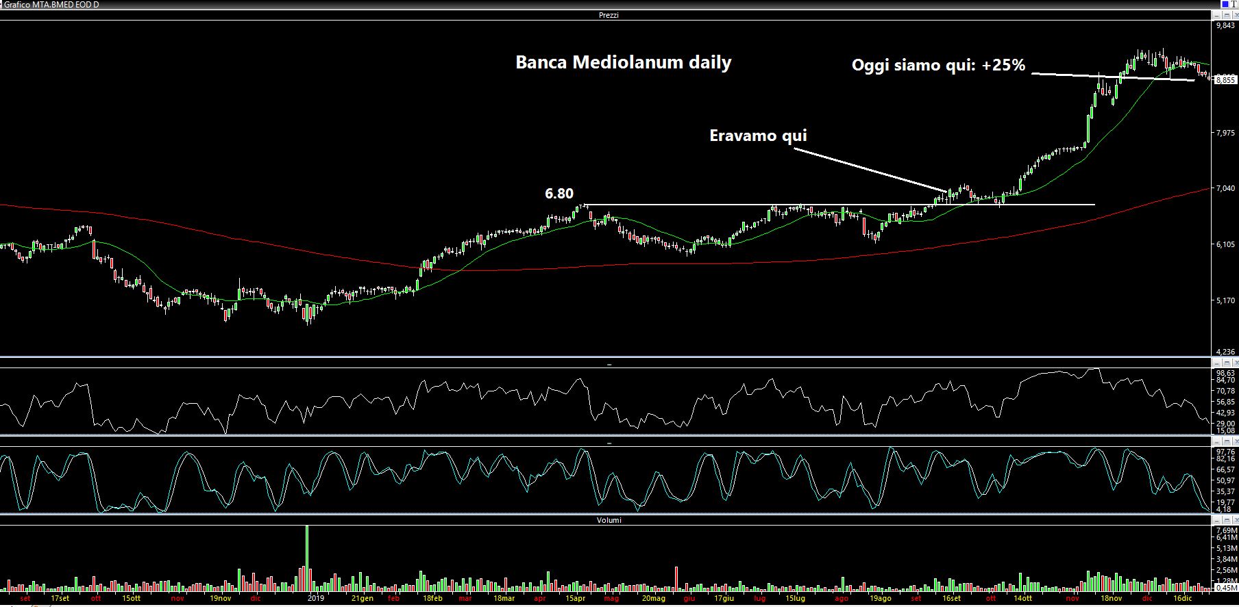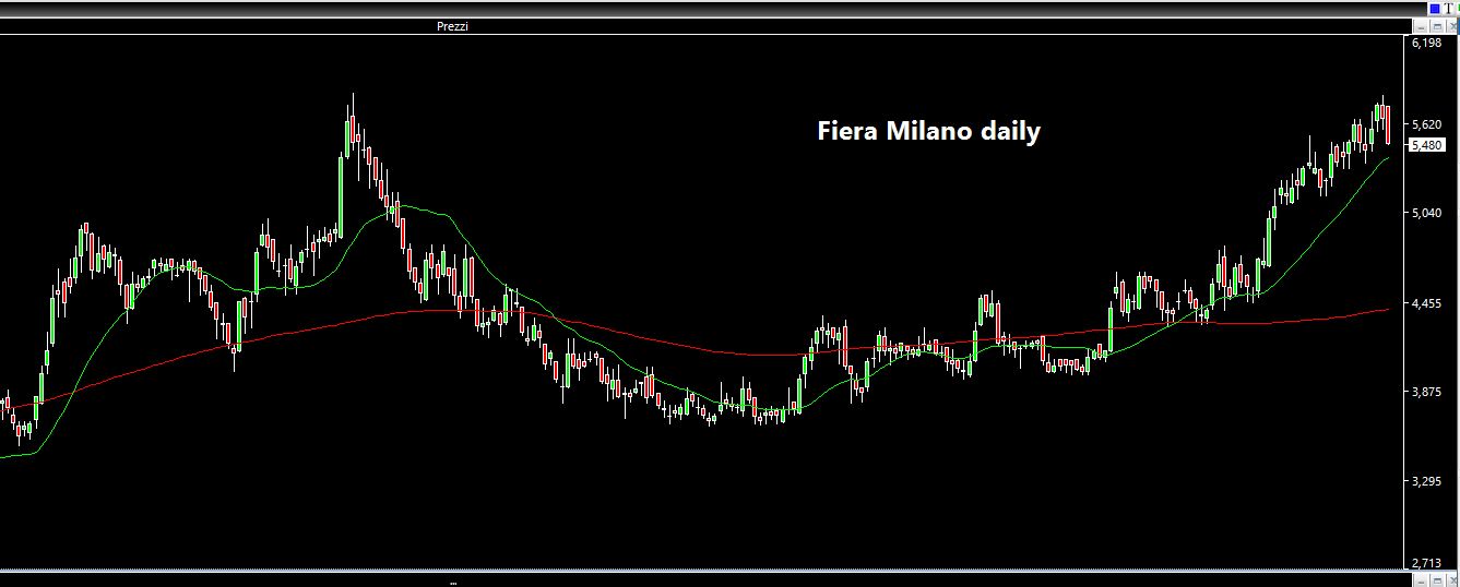 E proprio in quell'articolo segnalavo con un grafico la rottura rialzista di Banca Mediolanum (pur non aspettandomi un movimento così esplosivo che di lì a poco si sarebbe verificato), l'interessante configurazione grafica di Fiera Milano, il possibile esaurimento della spinta rialzista su Pininfarina. Il tutto condito con un pizzico di argento.