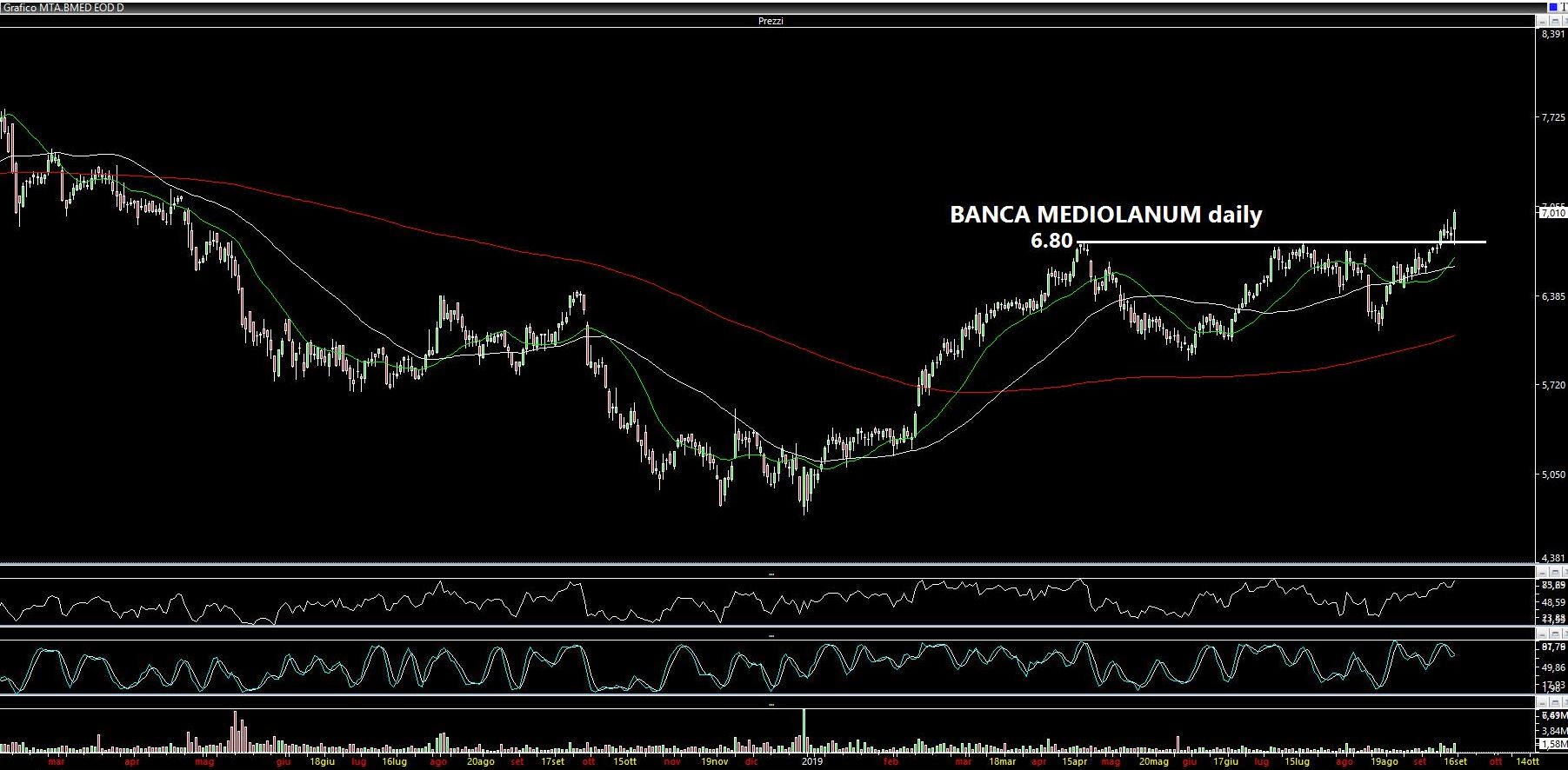 Ne avevo scritto verso la fine di Agosto (https://www.lombardreport.com/2019/8/24/prox-week/) evidenziando come fosse soggetta a swings notevoli. Ieri (venerdì) pare abbia rotto una trendline dinamica discendente e che quindi stia mano a mano per rompere la compressione di volatilità in cui è rimasta ingabbiata da oltre un mese. Sarà la volta buona? I volumi sul daily sono interessanti, con oltre 900 mila pezzi scambiati. A questo punto i punti chiave al rialzo si collocano a 4.33 e a 4.37 euro. ​