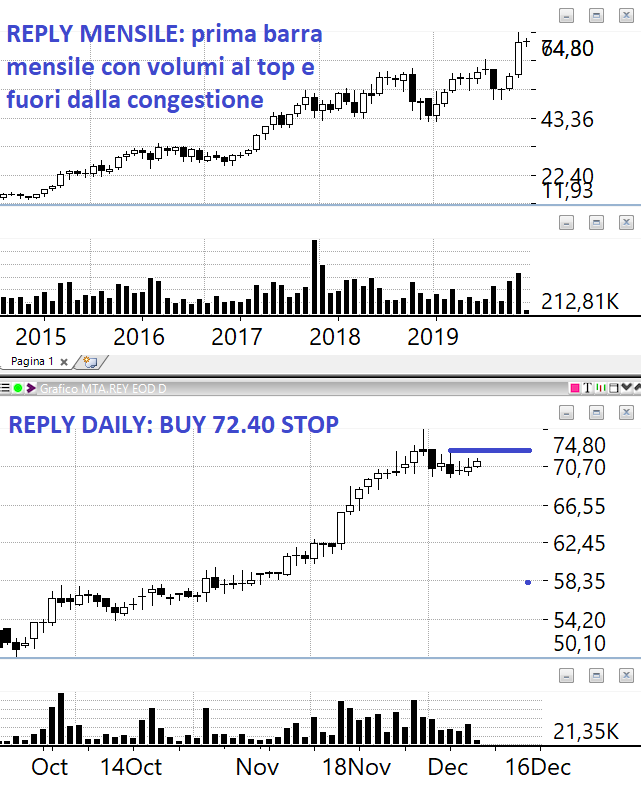 TAMBURI: prima barra che fuoriesce da una congestione orizzontale sul mensile. Sul daily uncino in corso. Non ci colpiscono molto i risultati fondamentali e nemmeno i volumi sul mensile. Il segnale a livello di prezzi c’è ma manca tutto il resto. Stiamo fuori.