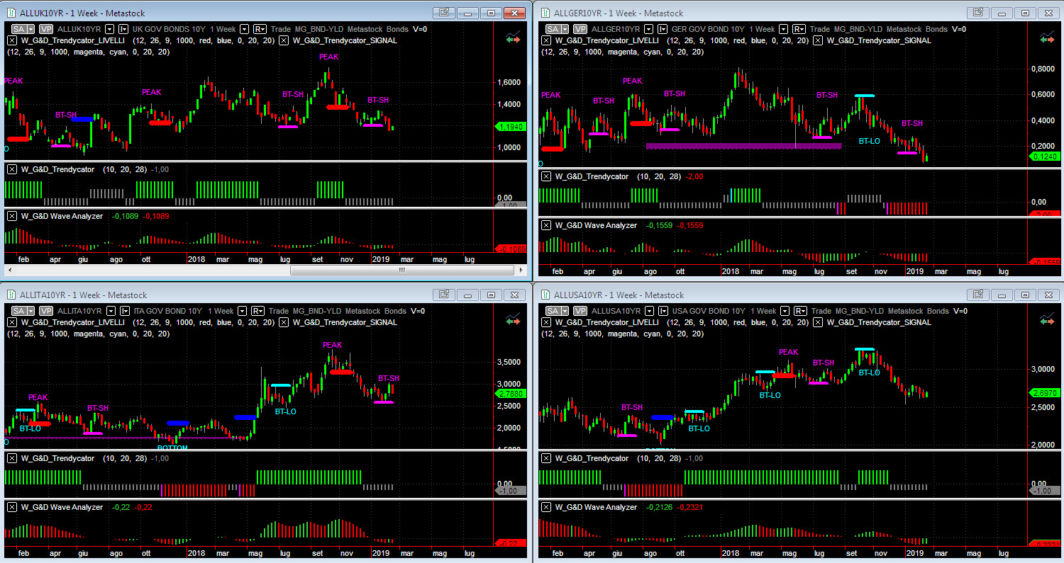 Osservando – a livello di analisi integrata – le curve dei rendimenti dei benchmark decennali dei principali mercati si confermano le tendenze osservate già dal novembre 2018 grazie al modello Trendycator. Il modello si mantiene NEUTRAL sull’area UK, con il Gilt che prosegue il suo consolidamento in area 1,20%; sull’area BUND Trendycator ha “visto” bene lo SHORT (ormai dodici settimane) con il rendimento che ha nuovamente ritoccato i minimi e ora sotto area 0,10%. Il Btp con Trendycator che si conferma NEUTRAL galleggia sempre tra area 2,60% e area 2,80% di rendimento. Anche sull’area USA Trendycator rimane in conformazione NEUTRAL con i rendimenti del decennale che dopo aver toccato il minimo del 2019 al 2,50% e dopo un rimbalzo è ora in range tra area 2,60% e 2,70%.