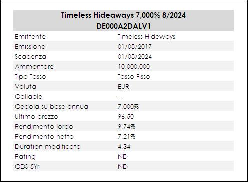 Il bond HY che analizziamo oggi è un tasso fisso della Timeless Hideaways, società che fornisce esclusivi palazzi di lusso e chalet di lusso commercializzati con il marchio TIMELESS HIDEAWAYS in collaborazione con TUI, il principale gruppo turistico europeo. Lo sviluppo del progetto, il noleggio, l'amministrazione e la vendita provengono da questo unico fornitore. Timeless Hideaways collabora con architetti, designer e partner selezionati nel settore immobiliare e il suo business è attualmente concentrato su Austria, Germania e Isole Baleari. Infine, la società collabora strettamente con la banca austriaca Raiffeisenbank per il finanziamento dei vari progetti.