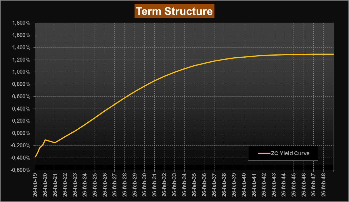 Passando alle nostre analisi, con la nostra consueta lettura del mercato obbligazionario attraverso la ZC-Yield Curve, registriamo questa settimana rendimenti impliciti non troppo diversi rispetto alla scorsa rilevazione, con il tratto a lunga leggermente più mosso e ora in area 1,20% per le scadenze dal 2038; sulla scadenza a 10 anni scendiamo ancora e siamo in area 0,67%. Stabili anche i forward su Euribor 6 mesi che sul tratto a lunga rimangono prossimi ad area 1,80% e sul tratto a breve continuano a scontare una politica BCE ancora non restrittiva.