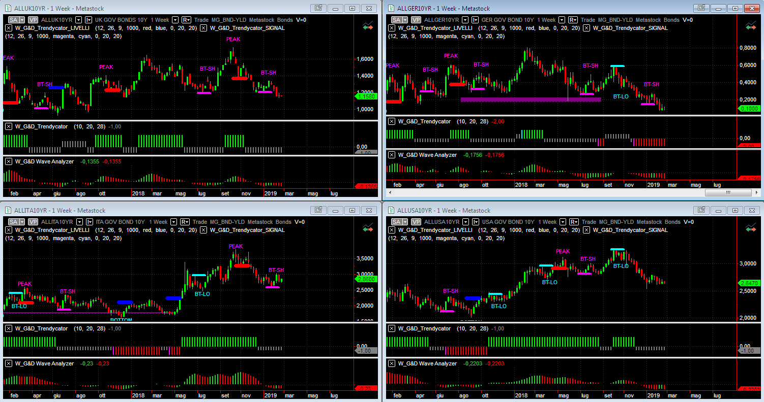 Osservando – a livello di analisi integrata – le curve dei rendimenti dei benchmark decennali dei principali mercati non abbiamo variazioni rispetto a quanto da tempo osserviamo sul modello Trendycator, ormai già da fine 2018. Il modello si mantiene NEUTRAL sull’area UK, con il Gilt che si porta però sotto area 1,20%; sull’area BUND Trendycator è ancora SHORT (ormai tredici settimane) con il rendimento che risale leggermente dai minimi ma rimane in area 0,10%. Il Btp vede Trendycator che si conferma NEUTRAL e galleggia sempre tra area 2,60% e area 2,80% di rendimento. Anche sull’area USA Trendycator rimane in conformazione NEUTRAL con i rendimenti del decennale sempre in prossimità dei minimi del 2019, in range tra area 2,60% e 2,70%.