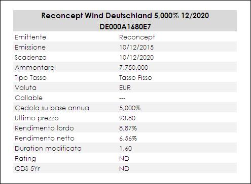 Il bond HY che analizziamo oggi è un tasso fisso della Reconcept GmbH, società stata fondata nel 1998 come filiale di WKN AG – uno dei più grandi sviluppatori nel settore delle energie rinnovabili in Europa e negli Stati Uniti – con l'obiettivo di avviare fondi di investimento nel settore dell'energia eolica e immetterli sul mercato dei capitali. Nel 2005, la società ha ampliato il suo portafoglio di prodotti a fondi fotovoltaici e di biomassa.