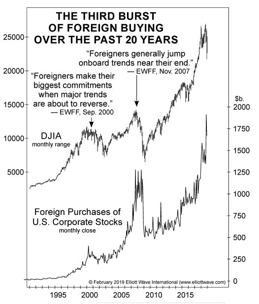 Per oltre un anno abbiamo visto e pubblicato indicatori vari di Sentiment che suggerivano quantomeno prudenza. Man mano che gli indici inanellavano nuovi massimi nella seconda parte del 2018, la massa degli investitori dimostrava di non temere i nuovi massimi storici, ma anzi di attenderseli. Sul Financial Forecast USA di questo mese viene mostrato un grafico che mette a confronto il Dow Jones con l’andamento degli acquisti effettuati dagli investitori stranieri.