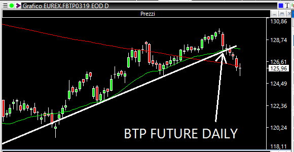 Prima di tutto permettetemi di ricordare che lo spread è salito drasticamente fino a 290 bp. Di certo il mercato non poteva comportarsi particolarmente bene. C'è stata la rottura del livello chiave di indice FTSEMIB a 19850 fino ad una estensione massima in area 20000, psicologicamente importante in quanto cifra tonda. Poco importa. Il problema vero, a mio modo di vedere, è che quella rottura è avvenuta in concomitanza dell'abbassamento delle stime sul PIL italiano da parte della Commissione Europea (dall'1,2% allo 0,2%). Abbassamento che ha comportato un continuo indebolimento del future sul BTP, che ha così inanellato una serie di sedute ribassiste. Come già scrivevo la settimana scorsa, l'1% potrebbe significare dover trovare tra i 15 ed i 20 miliardi di euro aggiuntivi. Insomma, il cielo potrebbe non essere più così sereno. Se aumenta lo spread (magari non tanto con la Germania quanto con paesi che ci assomigliano, come Grecia, Spagna e Portogallo), aumenta il rischio Paese, diminuisce l'appeal del sistema Italia, aumentano i tassi per collocare i nuovi titoli, le banche (che ne hanno già 250 miliardi) zavorrano l'indice principale. Infatti il BTP future, sulla cui forza nutrivo qualche dubbio già la settimana passata, non ha fatto altro che scendere: cinque sedute consecutive al ribasso. E quando si scende, come dico sempre, anche la barca più leggera e veloce rischia di toccare il fondo.