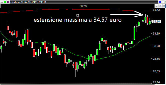 Dopo la rottura dei 32.50 euro il titolo ha avuto un discreto allungo ed il suo viaggio è finito qui: a 33.80 euro