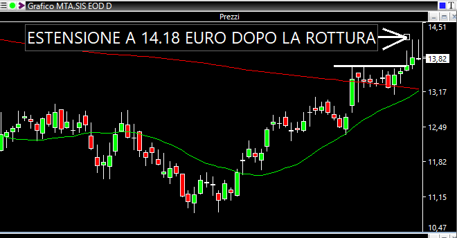 Dopo cinque giorni, invece, il titolo ha provato nuovamente un allungo oltre i 12 euro fino ad una estensione massima a 12.38 euro. In questo caso però ha funzionato molto bene il box che avevo segnalato (11.60/12.00), con una estensione sui livelli minimi che in un paio di sedute ha toccato millimetricamente 11.65 ed 11.63 euro. Un break in a basso rischio.