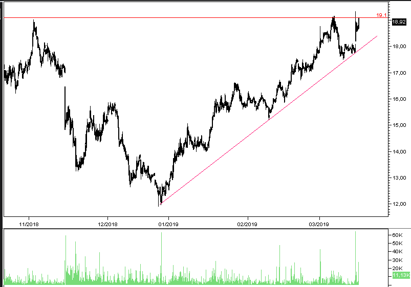 L'azione è ben impostata, con discreti volumi giornalieri e la possibilità che superi con successo il valore dei 19€ è molto elevata, per puntare diritto ai 21€, laddove è consigliabile incassare il gain e continuare ad osservare, in quanto, sopra tale valore, si esce da un bel trend negativo, con prospettive di ulteriori guadagni.