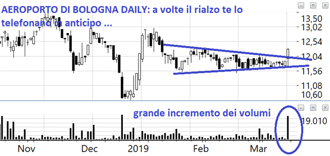 AEROPORTO DI BOLOGNA: a volte il rialzo te lo telefonano in anteprima … giovedì scorso infatti sono usciti i dati del bilancio 2018 e i numeri sono davvero interessanti: ricavi in aumento del 15%, traffico passeggeri cresciuto del 3.8%, margine operativo lordo +13%. Venerdì hanno comprato pesante come da grafico accluso ma se hanno comprato pesante lo hanno fatto perché sale e quindi il gioco non è finito qui …